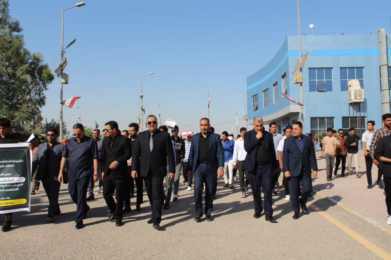شارك اساتذة وموظفو وطلبة كلية الادارة والاقتصاد في الوقفة التضامنية التي نظمتها رئاسة جامعة المثنى لتأبين شهداء المقاومة وادانة الجريمة الصهيوينة باغتيال السيد الشهيد حسن نصر الله رضوان الله تعالى عليه