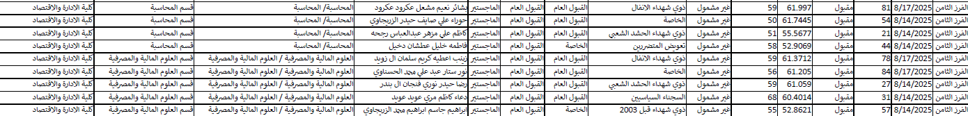 تعلن عمادة الكلية اسماء المقبولين في الدراسات العليا/الماجستير في قسمي المحاسبة والعلوم المالية (تدوير الناجحين ) من قناة العام والخاص الى الامتيازات