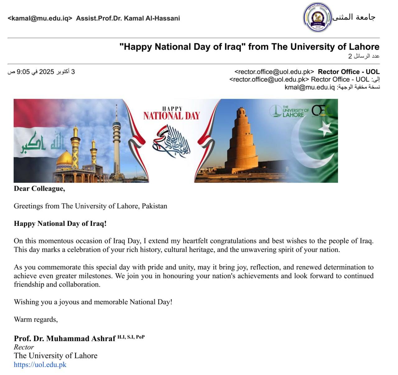 14 أكتوبر عميد الكلية (أ.م.د. كمال كاظم الحسني) يتلقى رسالة تهنئة من رئيس جامعة لاهور الباكستانية (الاستاذ الدكتور محمد أشرف) بمناسبة العيد الوطني لجمهورية العراق.