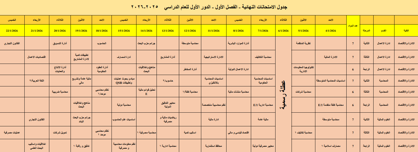 اعلنت عمادة كلية الادارة والاقتصاد جدول الامتحانات النهائية للدراسات الاولية للفصل الدراسي الاول للعام الدراسي 2025-2026 للاقسام العلمية الثلاث المحاسبة والعلوم المالية وادارة الاعمال وللدراستين الصباحية والمسائية .
