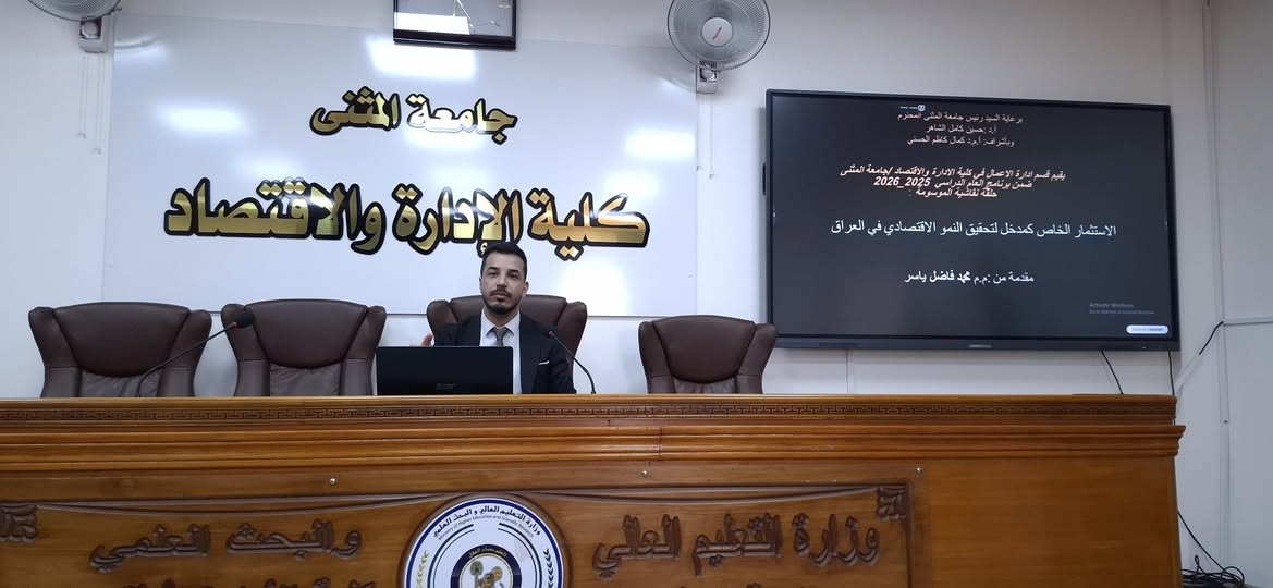 نظم قسم ادارة الاعمال وضمن الخطة العلمية للعام الدراسي 2026 2026 حلقة نقاشية بعنوان (الاسثمار الخاص كمدخل لتحقيق النمو الاقتصادي في العراق ) وقدمها المدرس المساعد محمد فاضل ياسر