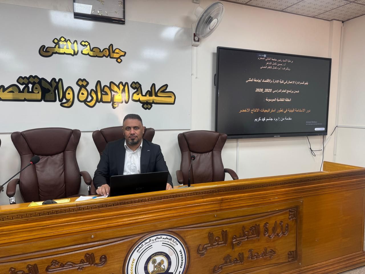 نظم قسم ادارة الاعمال حلقة نقاشية بعنوان (دور الاستدامة البيئية في تطوير استراتيجيات الإنتاج الأخضر ) وتضمنت محاضرة للاستاذ المساعد الدكتور جاسم محمد كريم بحضور عدد من اعضاء الهيئة التدريسية في القسم